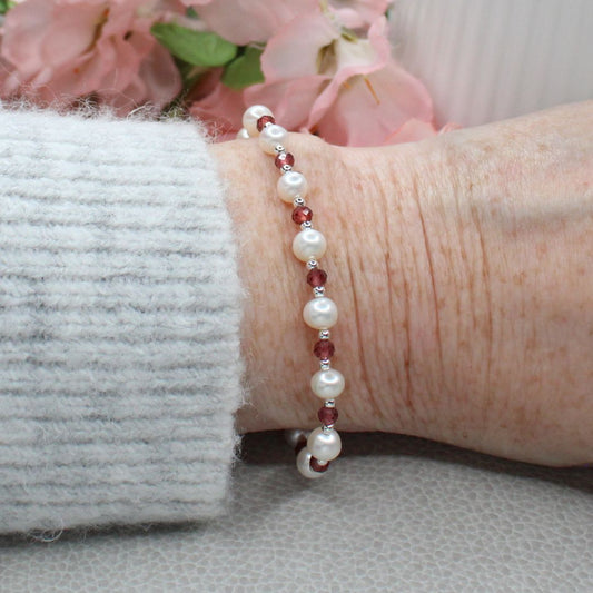 White Pearl & Rhodolite Garnet Bracelet - Rose Light